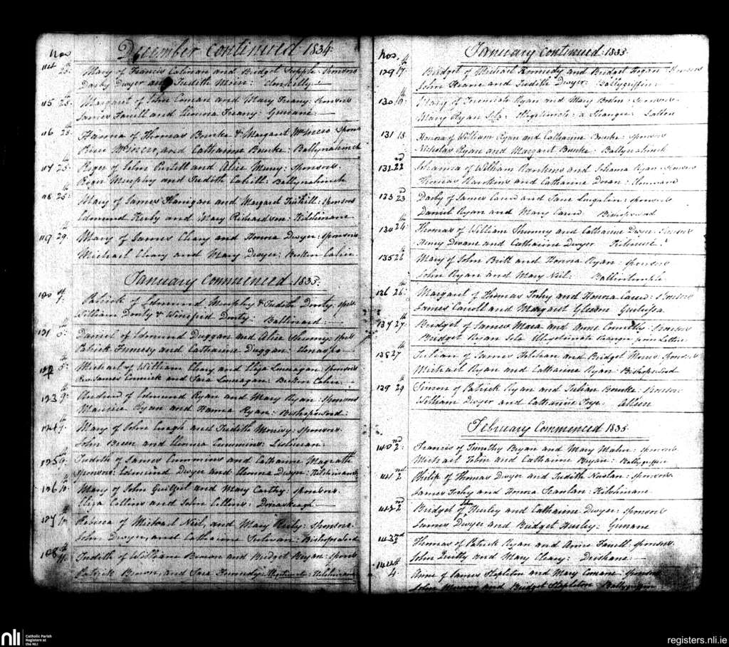 Knockavilla; County of Tipperary; Diocese of Cashel and Emly. Baptisms, Dec. 1834 to Feb. 1835