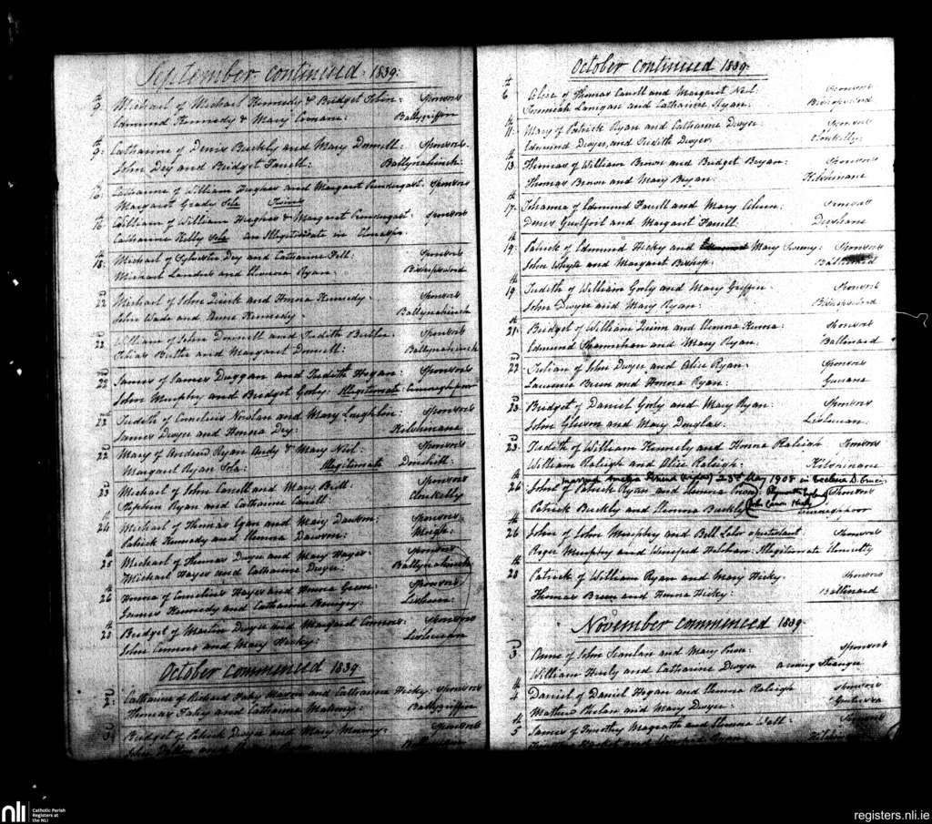 Knockavilla; County of Tipperary; Diocese of Cashel and Emly. Baptisms, Sep. 1839 to Nov. 1839