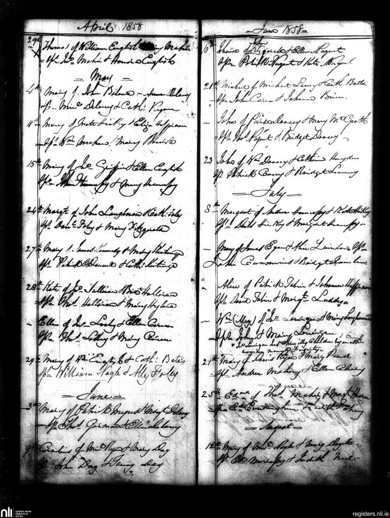 New Inn and Knockgraffon; County of Tipperary; Diocese of Cashel and Emly. Baptisms, Apr. 1858 to Aug. 1858