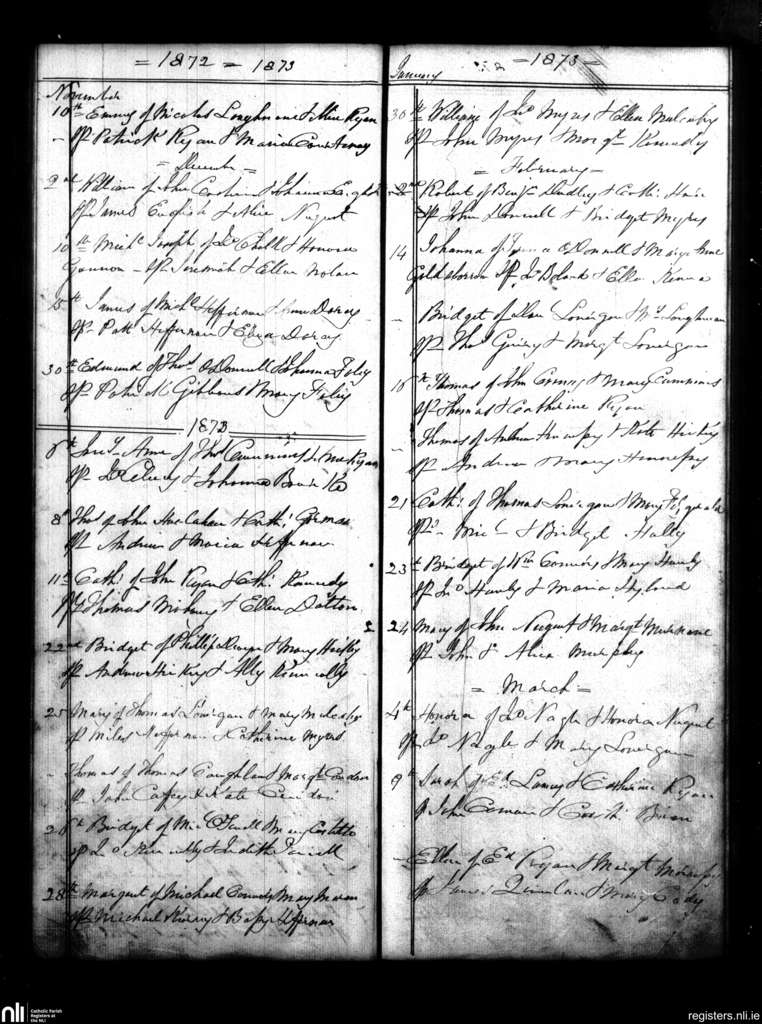 New Inn and Knockgraffon; County of Tipperary; Diocese of Cashel and Emly. Baptisms, Nov. 1872 to Mar. 1873
