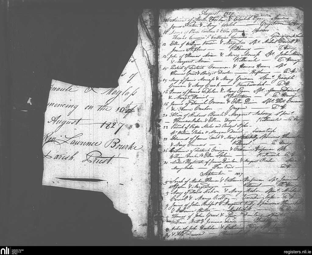 Killenaule; County of Tipperary; Diocese of Cashel and Emly. Baptisms, Aug. 1827 to Sep. 1827
