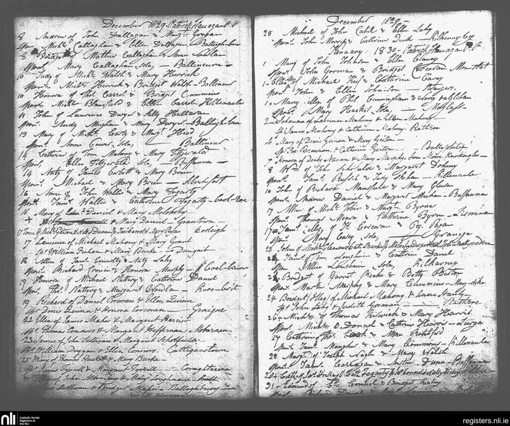 Killenaule; County of Tipperary; Diocese of Cashel and Emly. Baptisms, Dec. 1829 to Jan. 1830