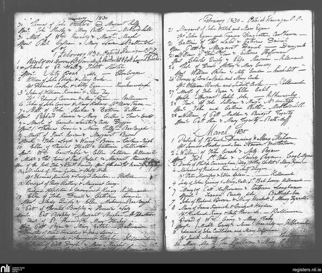 Killenaule; County of Tipperary; Diocese of Cashel and Emly. Baptisms, Jan. 1830 to Mar. 1830