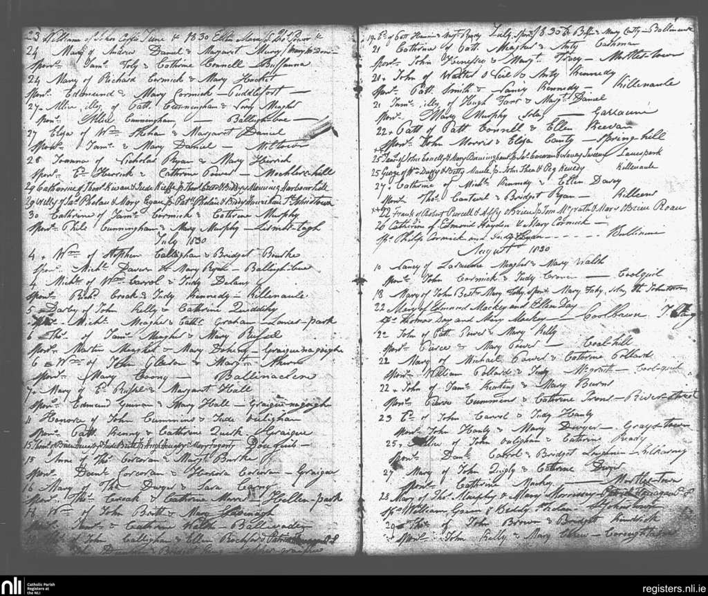 Killenaule; County of Tipperary; Diocese of Cashel and Emly. Baptisms, June 1830 to Aug. 1830
