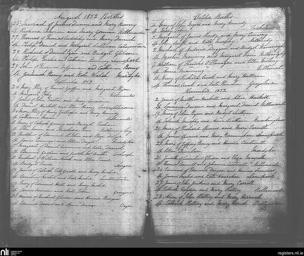 Killenaule; County of Tipperary; Diocese of Cashel and Emly. Baptisms, Aug. 1852 to Nov. 1852
