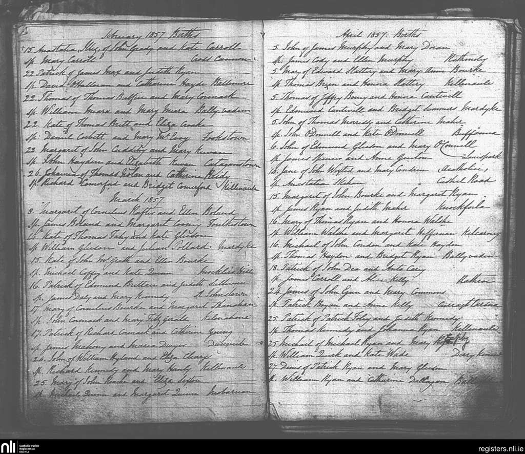 Killenaule; County of Tipperary; Diocese of Cashel and Emly. Baptisms, Feb. 1857 to Apr. 1857