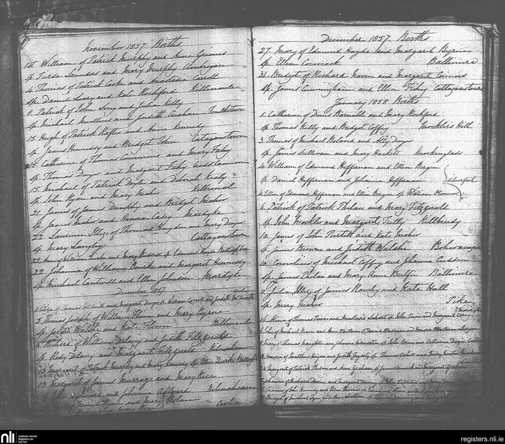 Killenaule; County of Tipperary; Diocese of Cashel and Emly. Baptisms, Nov. 1857 to Jan. 1858