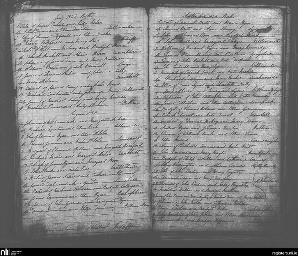 Killenaule; County of Tipperary; Diocese of Cashel and Emly. Baptisms, July 1858 to Sep. 1858