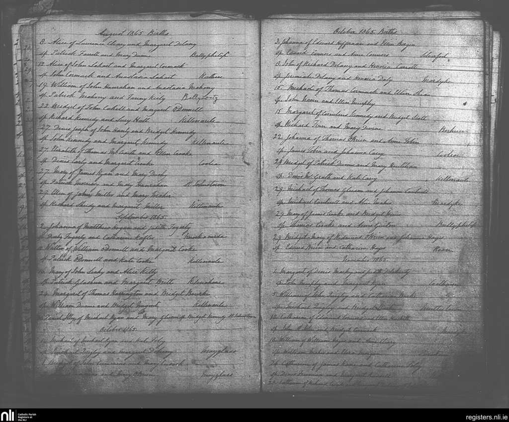 Killenaule; County of Tipperary; Diocese of Cashel and Emly. Baptisms, Aug. 1865 to Nov. 1865