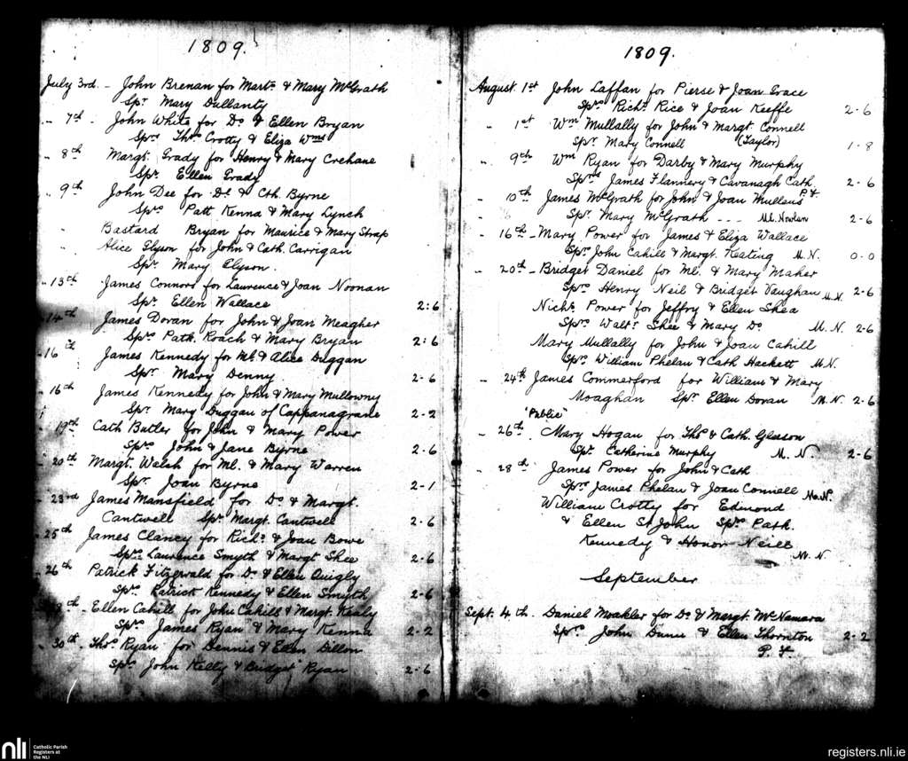 Mullinahone; County of Tipperary; Diocese of Cashel and Emly. Baptisms, July 1809 to Sep. 1809