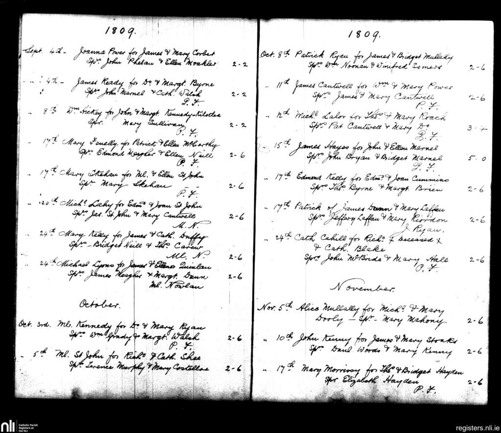 Mullinahone; County of Tipperary; Diocese of Cashel and Emly. Baptisms, Sep. 1809 to Nov. 1809