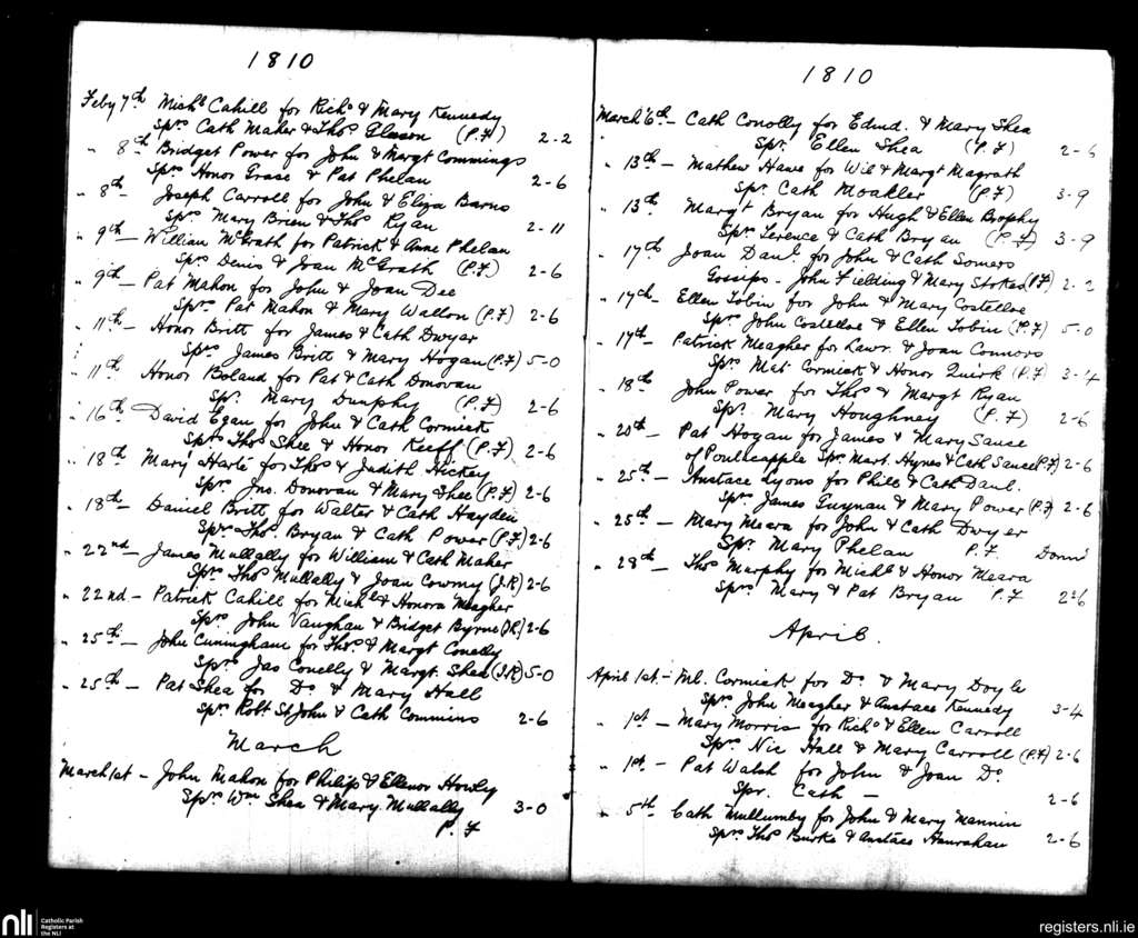 Mullinahone; County of Tipperary; Diocese of Cashel and Emly. Baptisms, Feb. 1810 to Apr. 1810