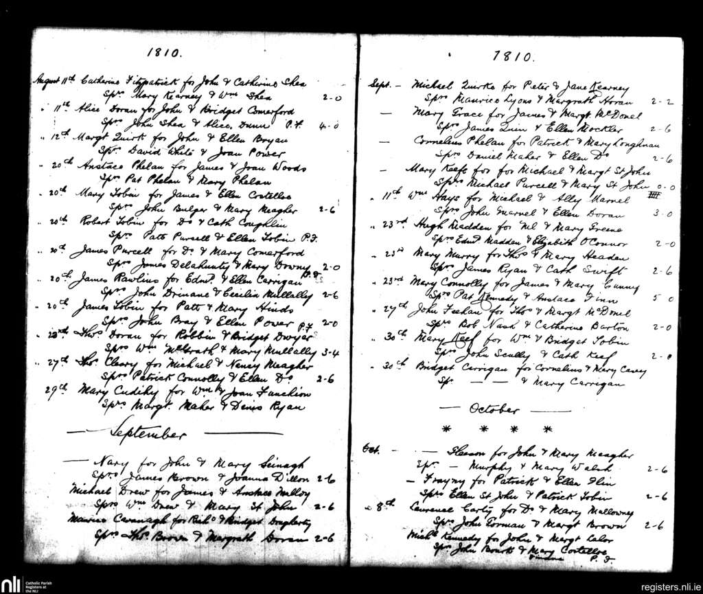 Mullinahone; County of Tipperary; Diocese of Cashel and Emly. Baptisms, Aug. 1810 to Oct. 1810