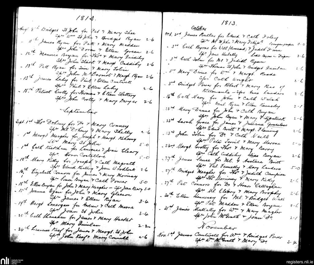 Mullinahone; County of Tipperary; Diocese of Cashel and Emly. Baptisms, Aug. 1813 to Nov. 1813
