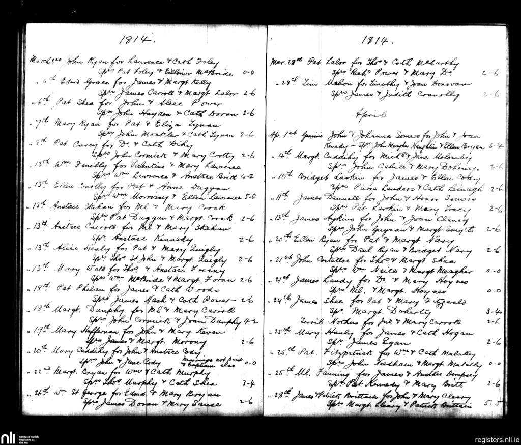 Mullinahone; County of Tipperary; Diocese of Cashel and Emly. Baptisms, Mar. 1814 to Apr. 1814