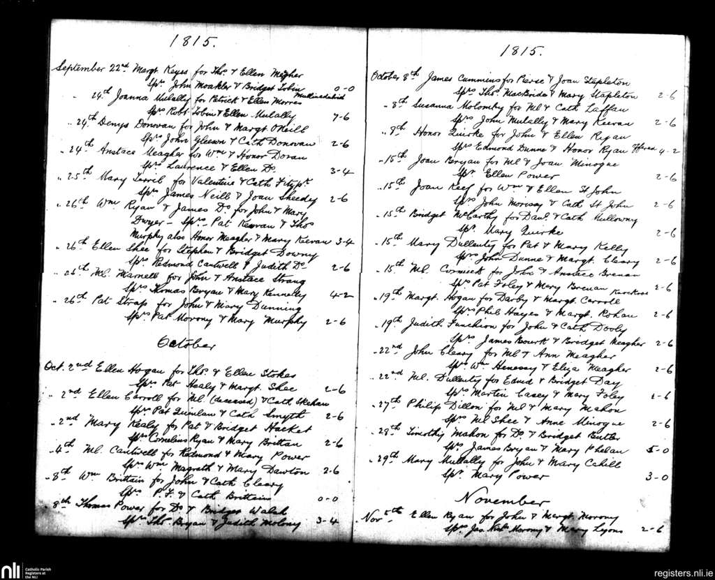 Mullinahone; County of Tipperary; Diocese of Cashel and Emly. Baptisms, Sep. 1815 to Nov. 1815