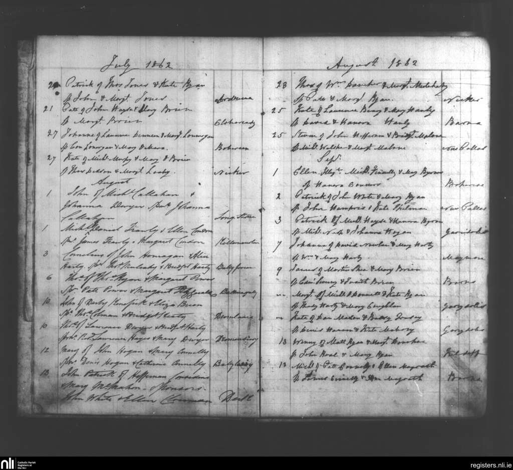 Pallasgreen and Templebredin; County of Limerick, Tipperary; Diocese of Cashel and Emly. Baptisms, July 1862 to Sep. 1862