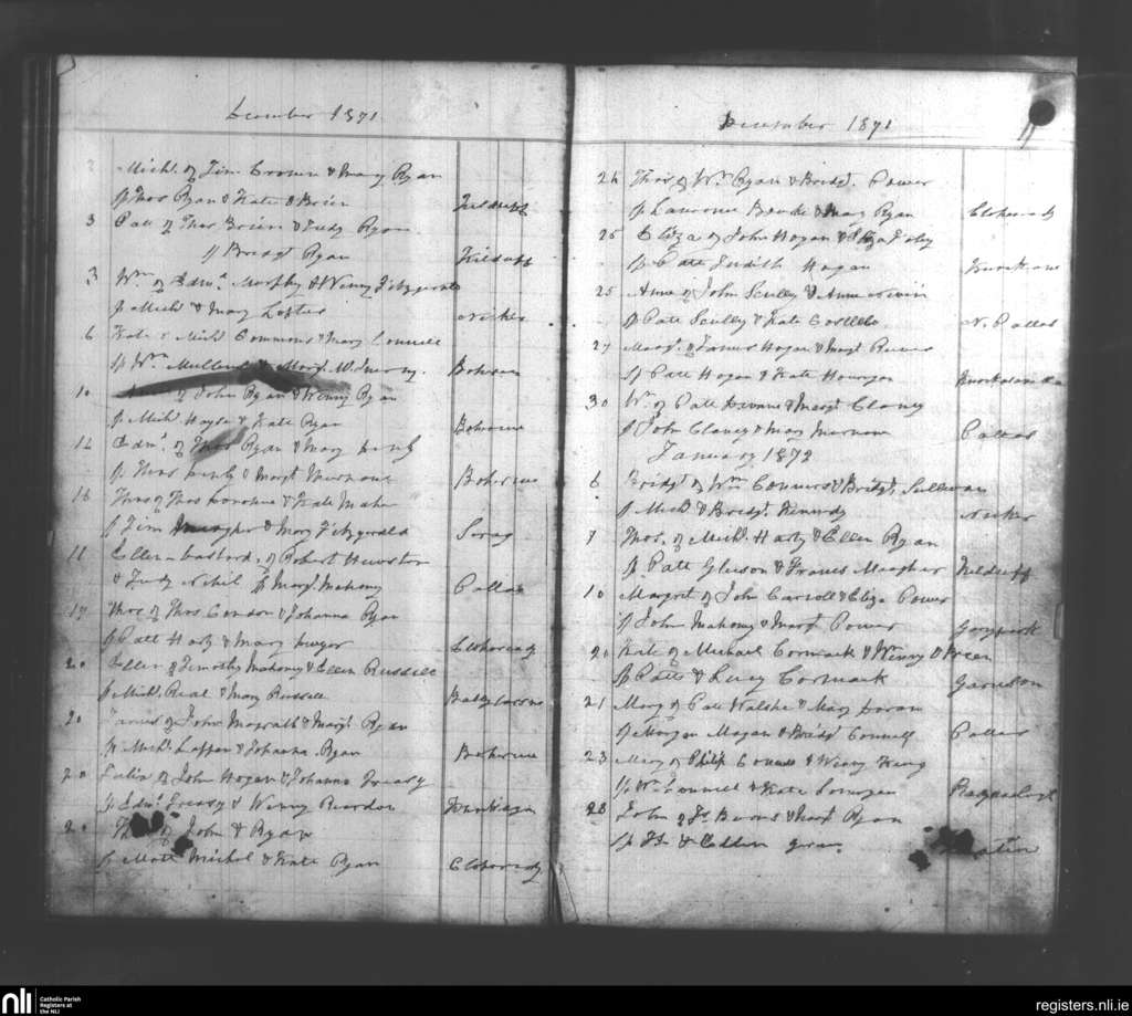 Pallasgreen and Templebredin; County of Limerick, Tipperary; Diocese of Cashel and Emly. Baptisms, Dec. 1871 to Jan. 1872