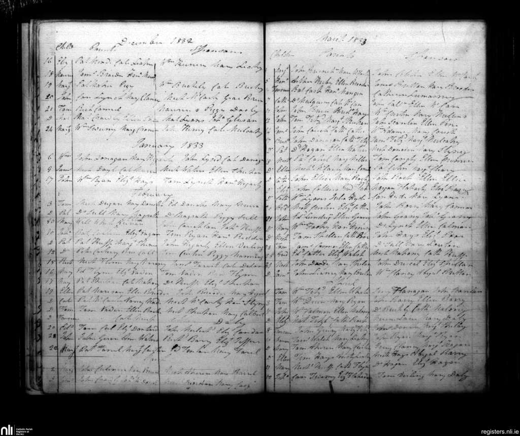 Castlelyons; County of Cork; Diocese of Cloyne. Baptisms, Dec. 1832 to Apr. 1833