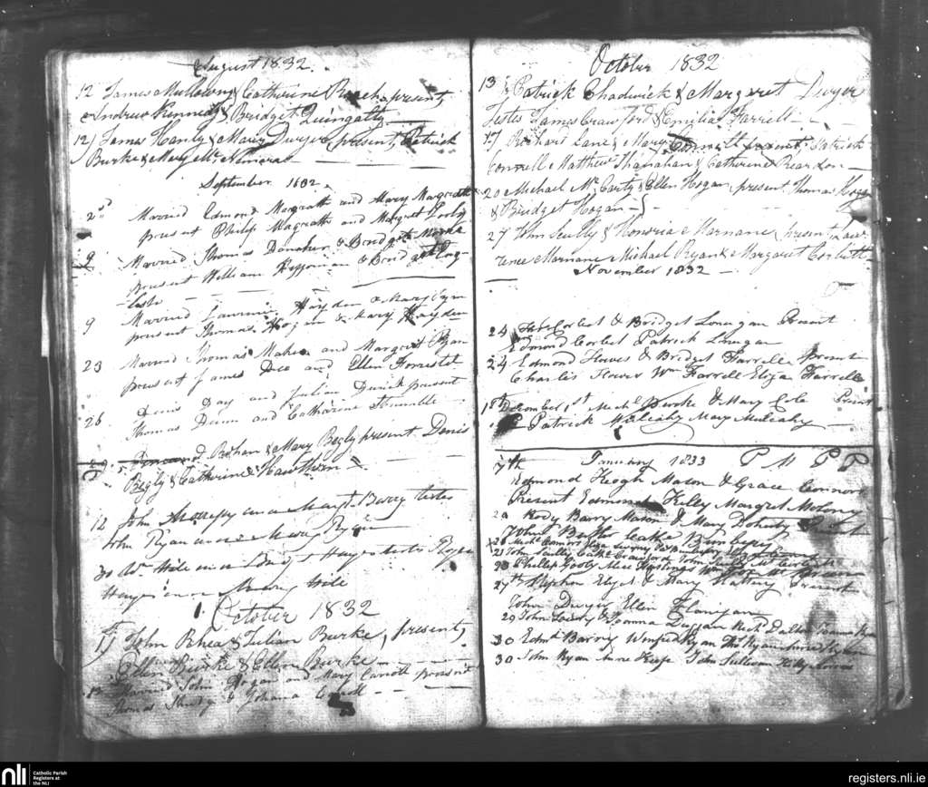 Tipperary; County of Tipperary; Diocese of Cashel and Emly. Marriages, Aug. 1832 to Jan. 1833