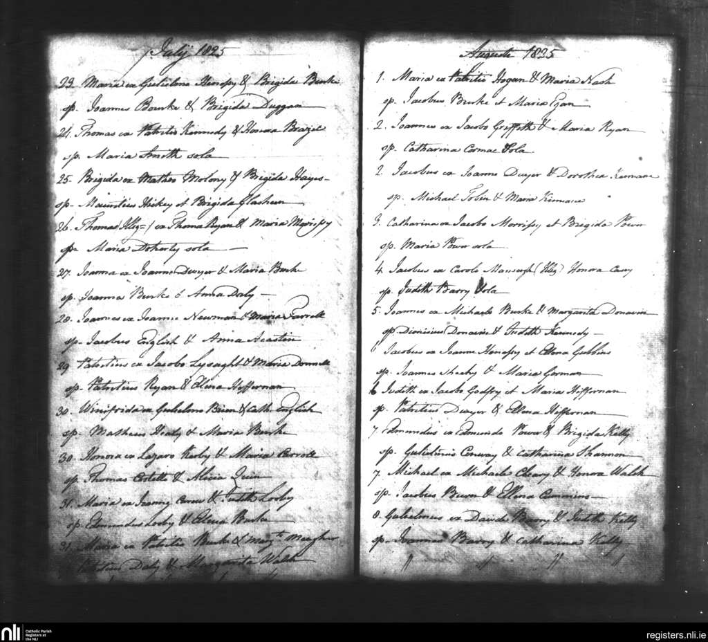 Tipperary; County of Tipperary; Diocese of Cashel and Emly. Baptisms, July 1825 to Aug. 1825