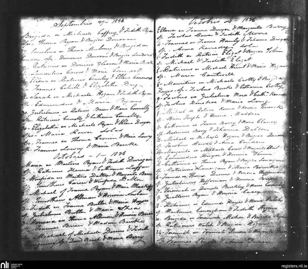 Tipperary; County of Tipperary; Diocese of Cashel and Emly. Baptisms, Sep. 1826 to Oct. 1826