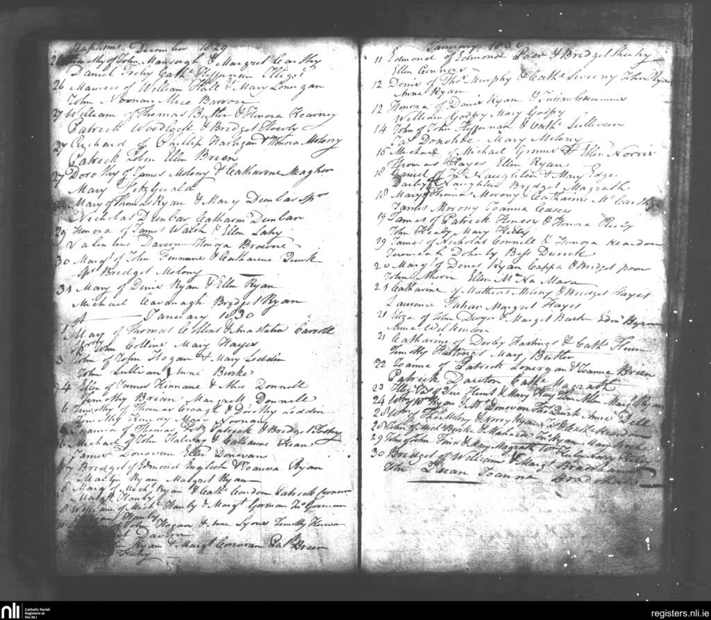 Tipperary; County of Tipperary; Diocese of Cashel and Emly. Baptisms, Dec. 1829 to Jan. 1830