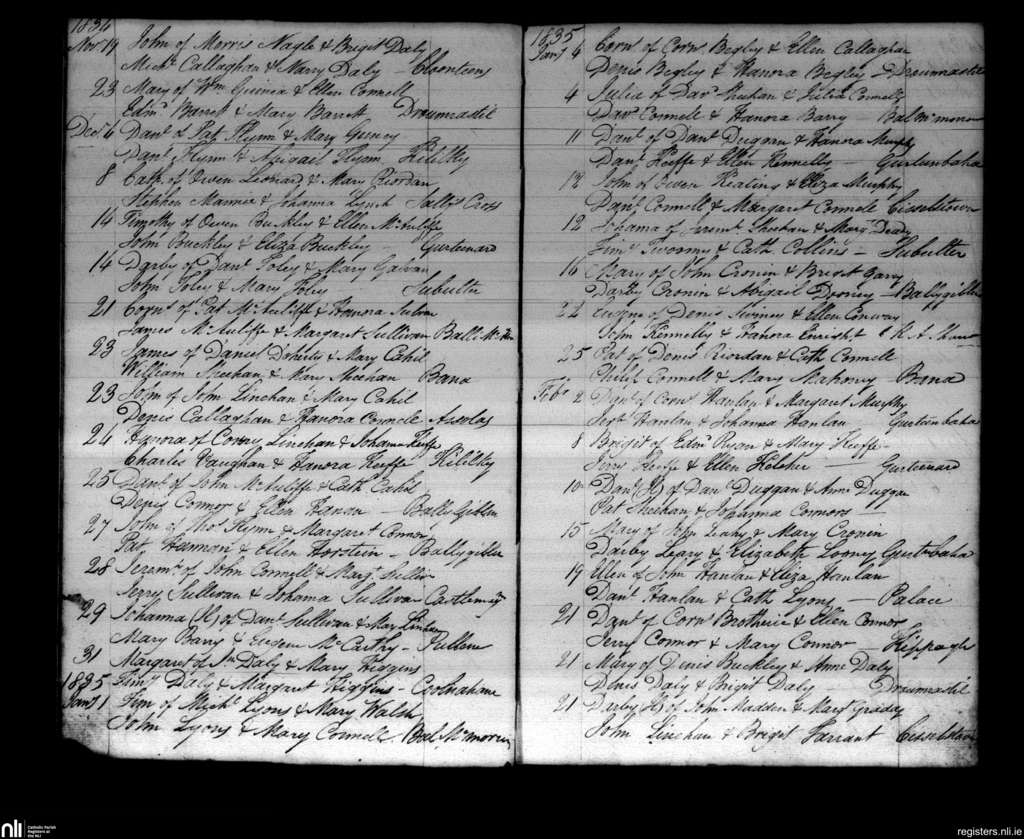 Castlemagner; County of Cork; Diocese of Cloyne. Baptisms, Nov. 1834 to Feb. 1835