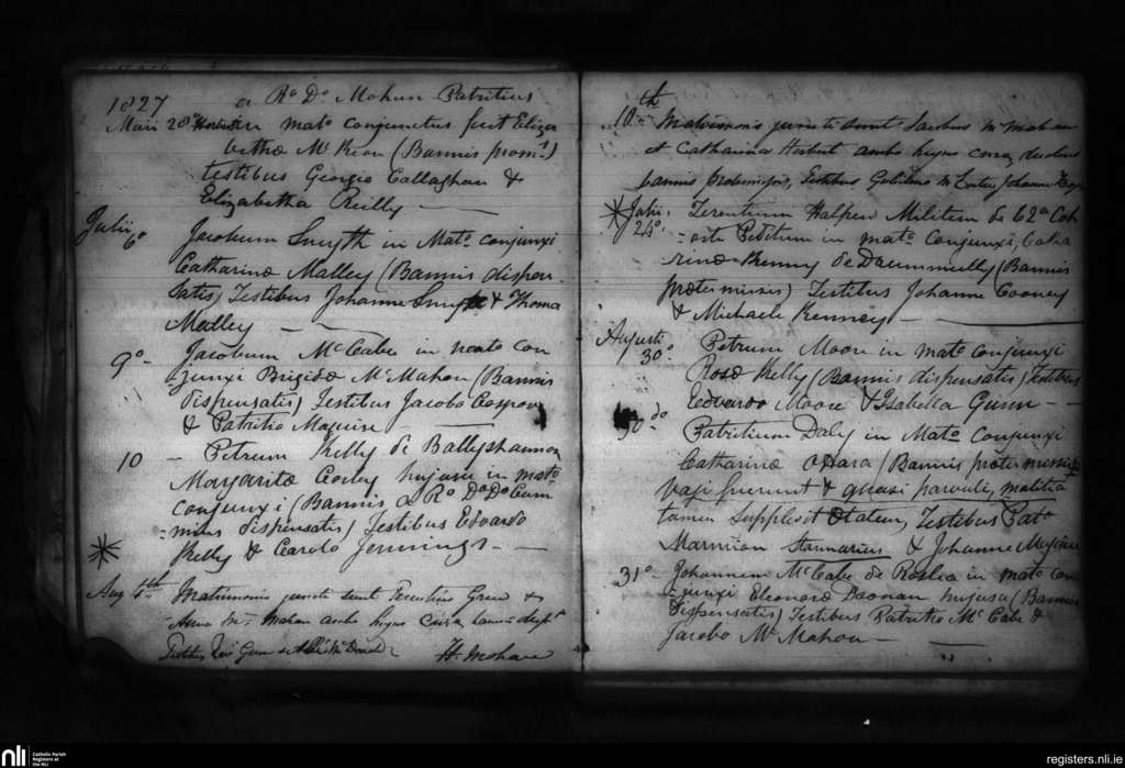 Clones; County of Fermanagh, Monaghan; Diocese of Clogher. Marriages, May 1827 to Aug. 1827