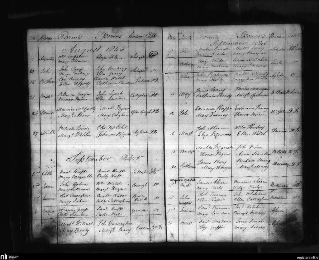 Aghada; County of Cork; Diocese of Cloyne. Baptisms, Aug. 1845 to Sep. 1845