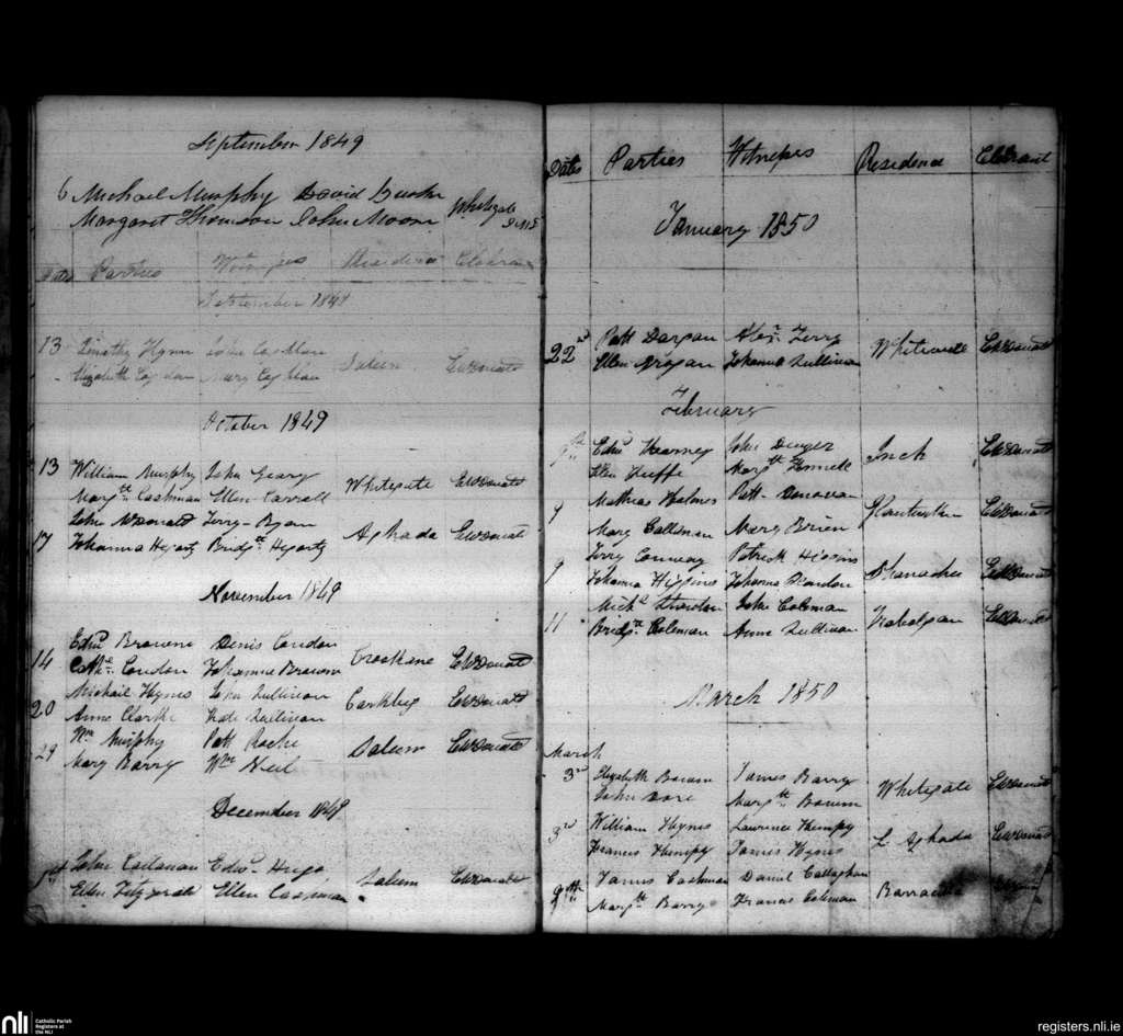 Aghada; County of Cork; Diocese of Cloyne. Marriages, Sep. 1849 to Mar. 1850