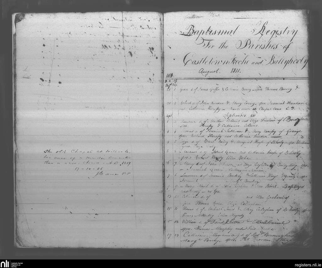 Castletownroche; County of Cork; Diocese of Cloyne. Baptisms, Aug. 1811 to Sep. 1811