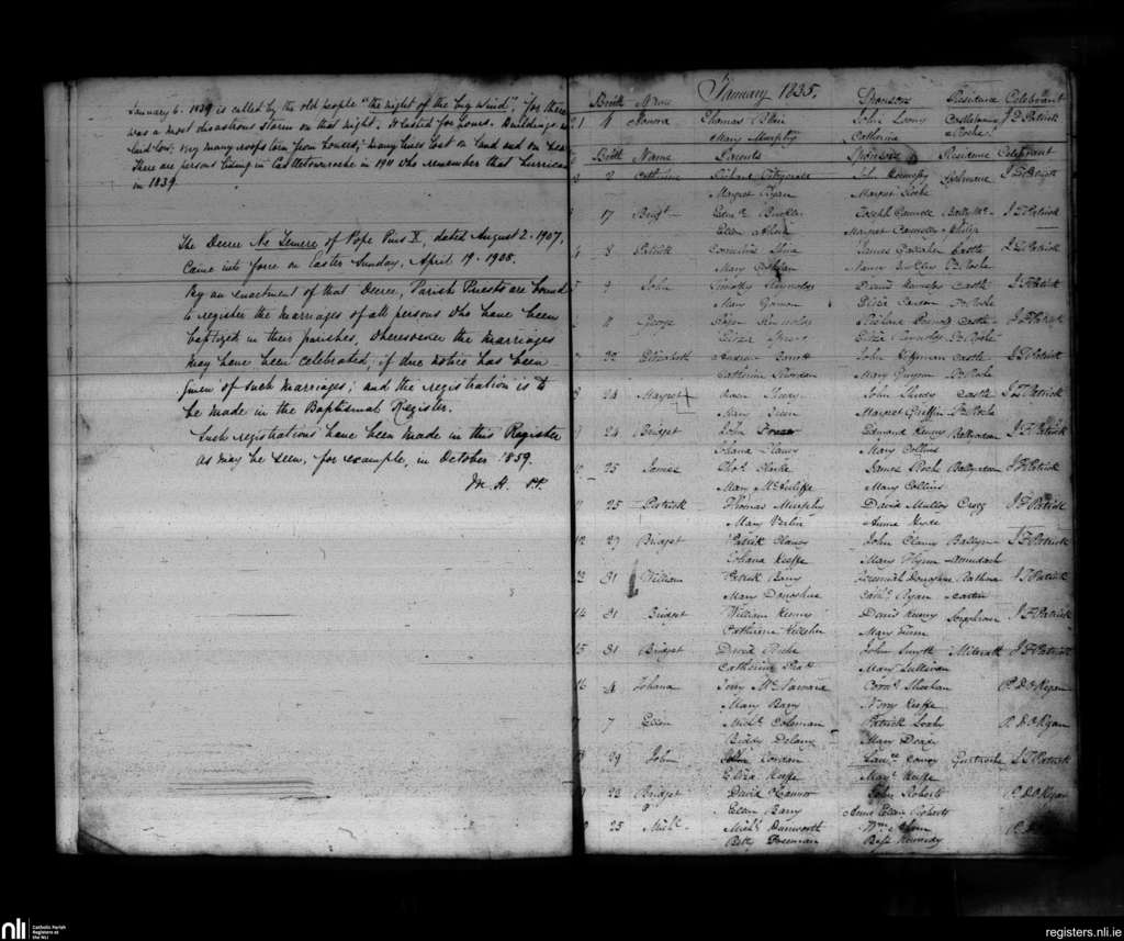 Castletownroche; County of Cork; Diocese of Cloyne. Baptisms, Jan. 1835