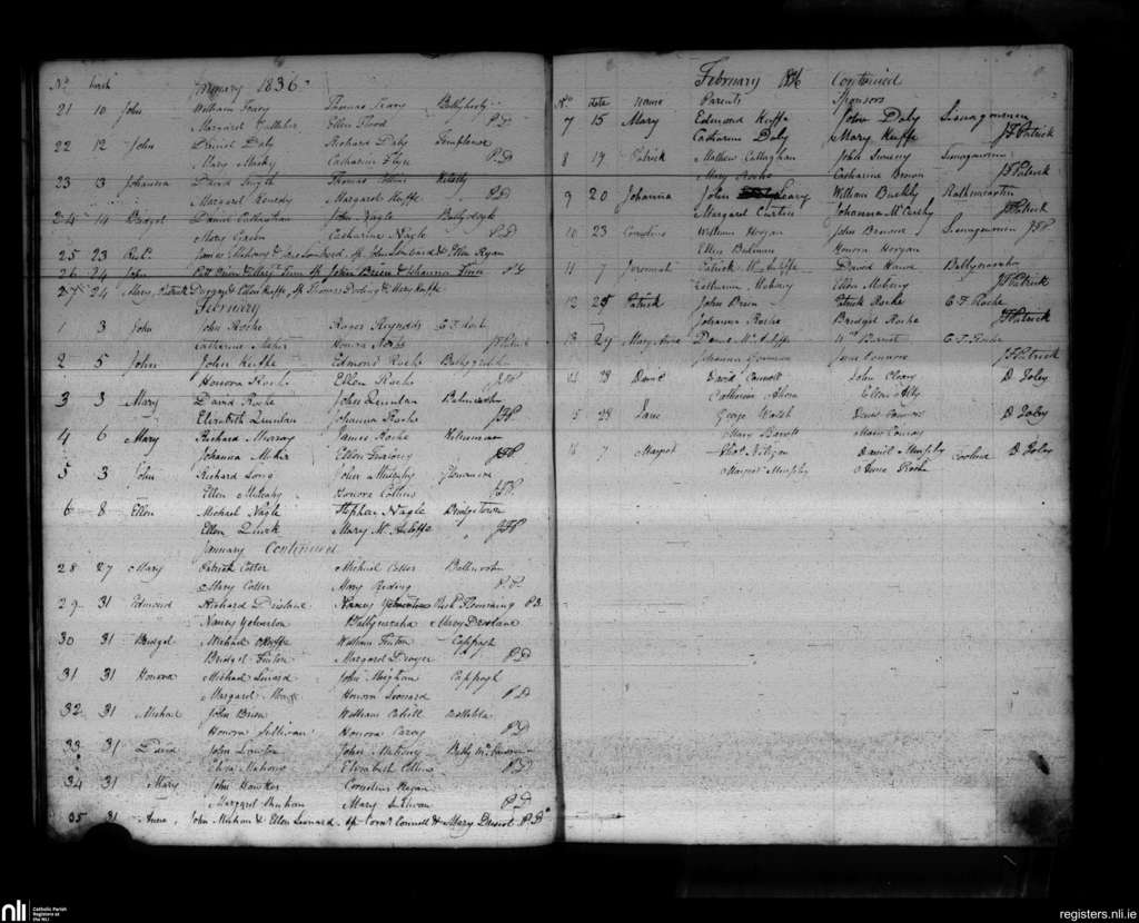 Castletownroche; County of Cork; Diocese of Cloyne. Baptisms, Jan. 1836 to Feb. 1836