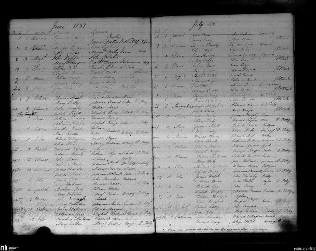 Castletownroche; County of Cork; Diocese of Cloyne. Baptisms, June 1838 to July 1838