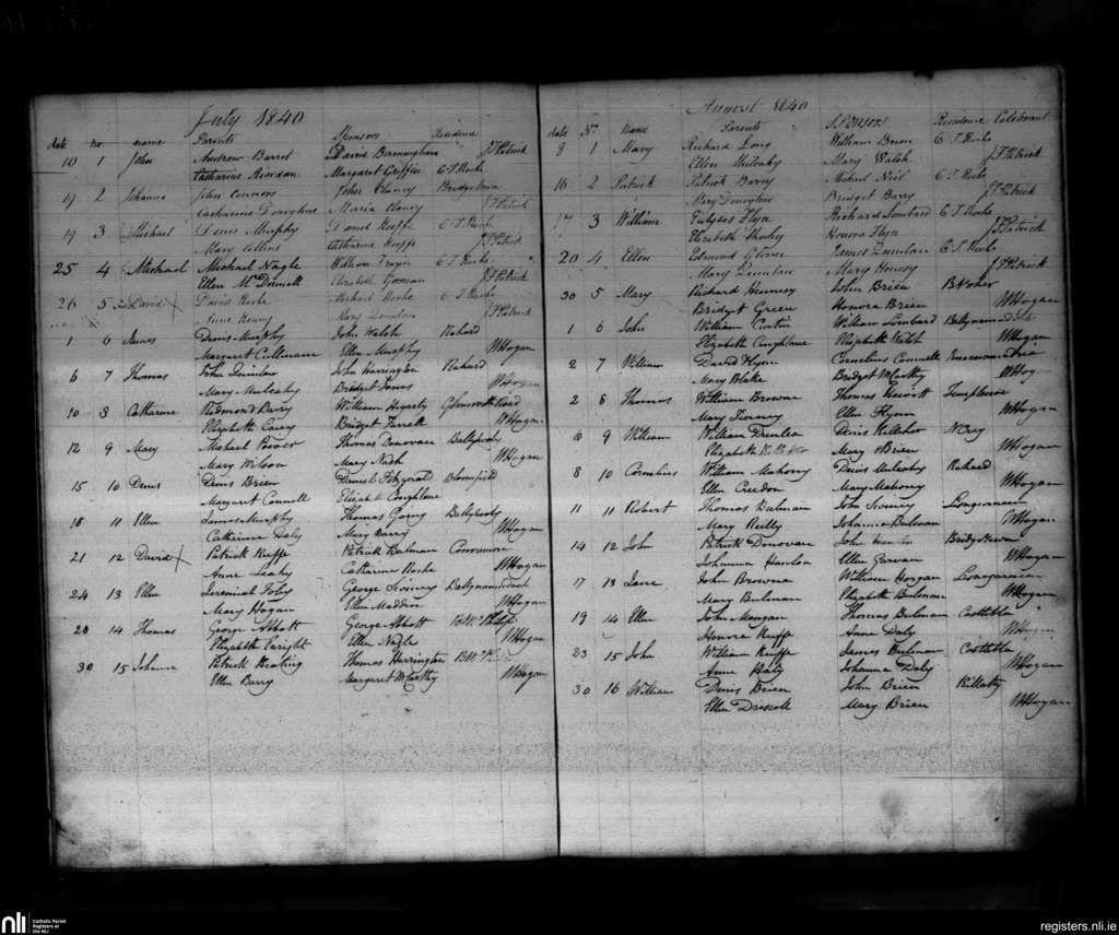 Castletownroche; County of Cork; Diocese of Cloyne. Baptisms, July 1840 to Aug. 1840