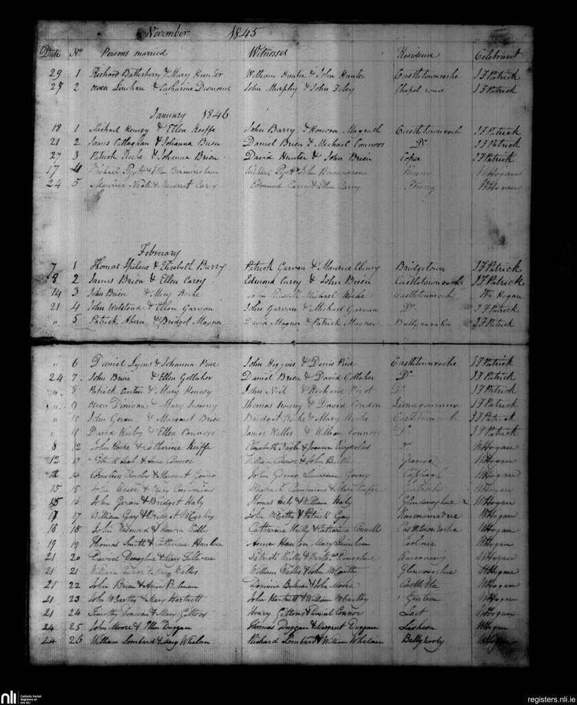 Castletownroche; County of Cork; Diocese of Cloyne. Marriages, Nov. 1845 to Feb. 1846