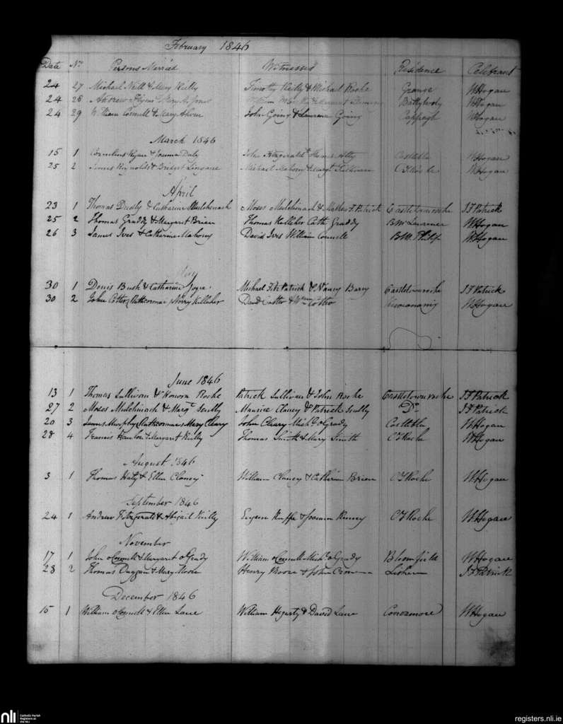 Castletownroche; County of Cork; Diocese of Cloyne. Marriages, Feb. 1846 to Dec. 1846
