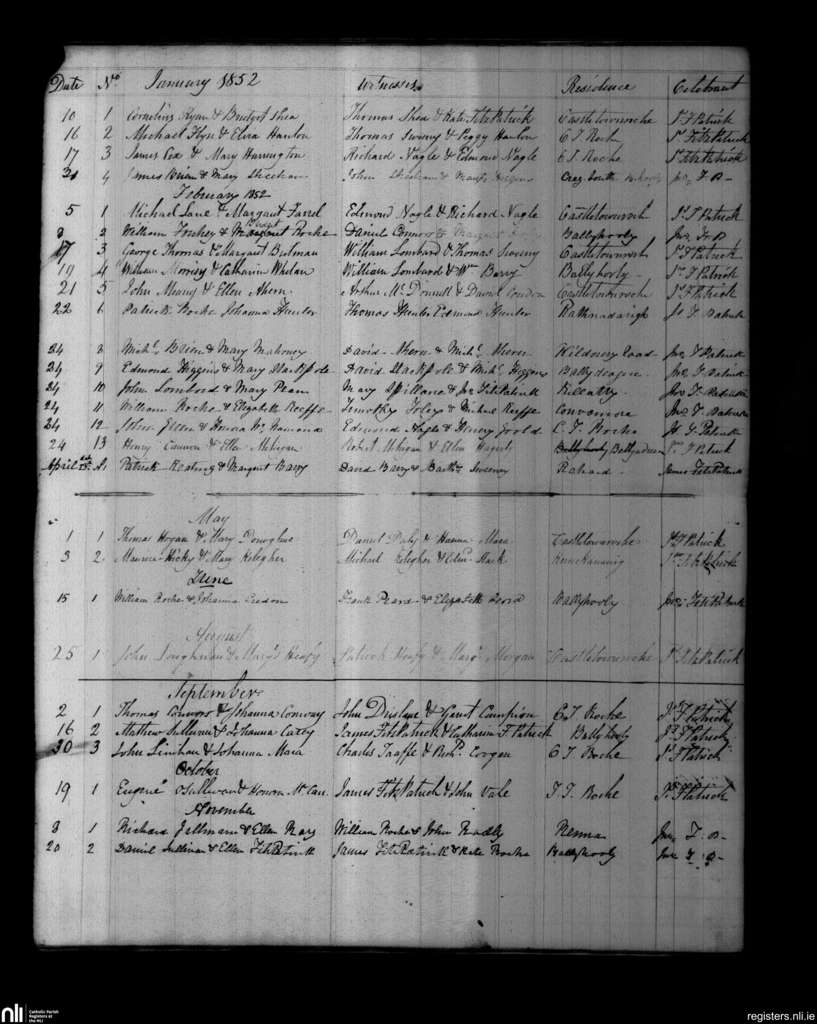 Castletownroche; County of Cork; Diocese of Cloyne. Marriages, Jan. 1852 to Nov. 1852