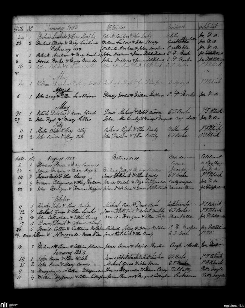 Castletownroche; County of Cork; Diocese of Cloyne. Marriages, Jan. 1853 to Jan. 1854