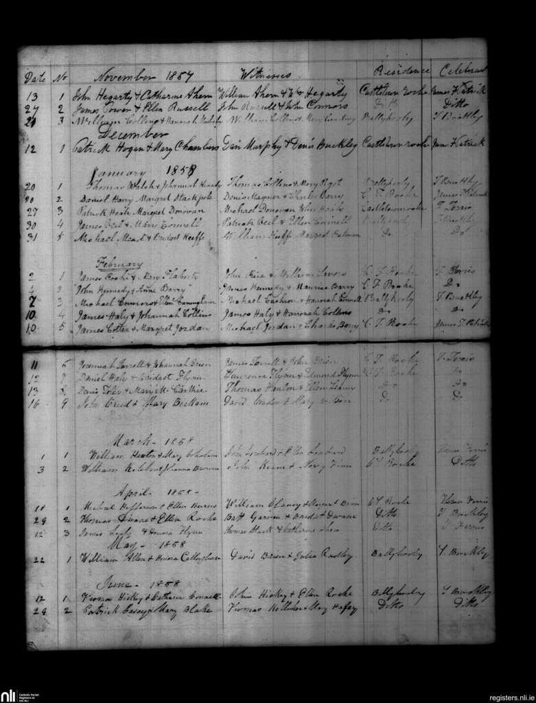 Castletownroche; County of Cork; Diocese of Cloyne. Marriages, Nov. 1857 to June 1858