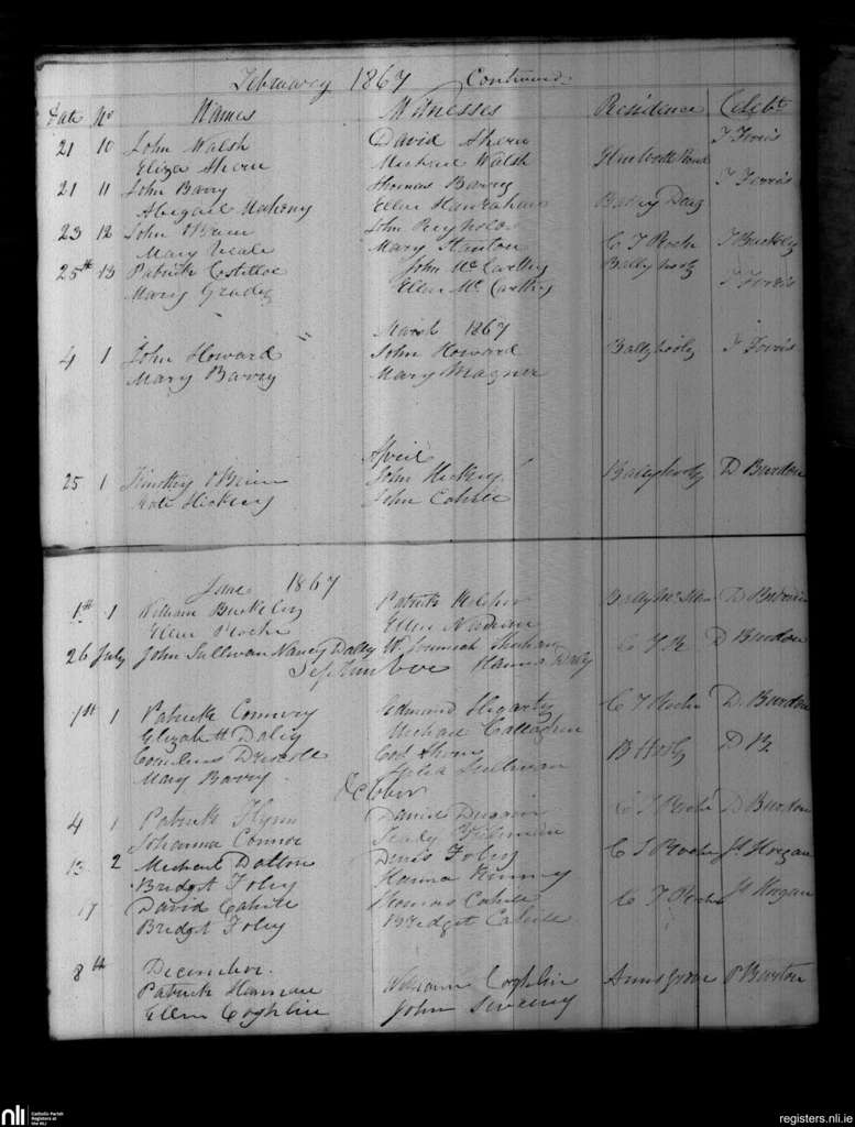Castletownroche; County of Cork; Diocese of Cloyne. Marriages, Feb. 1867 to Dec. 1867