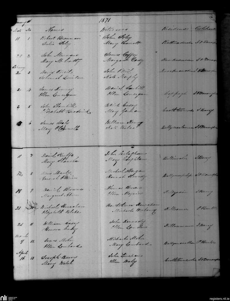Castletownroche; County of Cork; Diocese of Cloyne. Marriages, Jan. 1871 to Apr. 1871