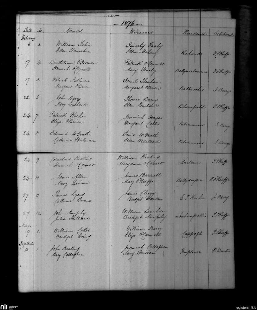 Castletownroche; County of Cork; Diocese of Cloyne. Marriages, Feb. 1876 to Sep. 1876