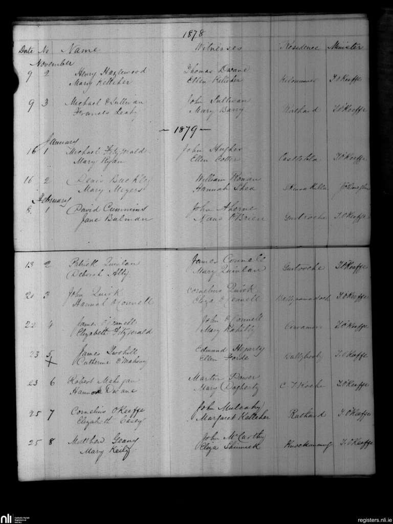 Castletownroche; County of Cork; Diocese of Cloyne. Marriages, Nov. 1878 to Feb. 1879