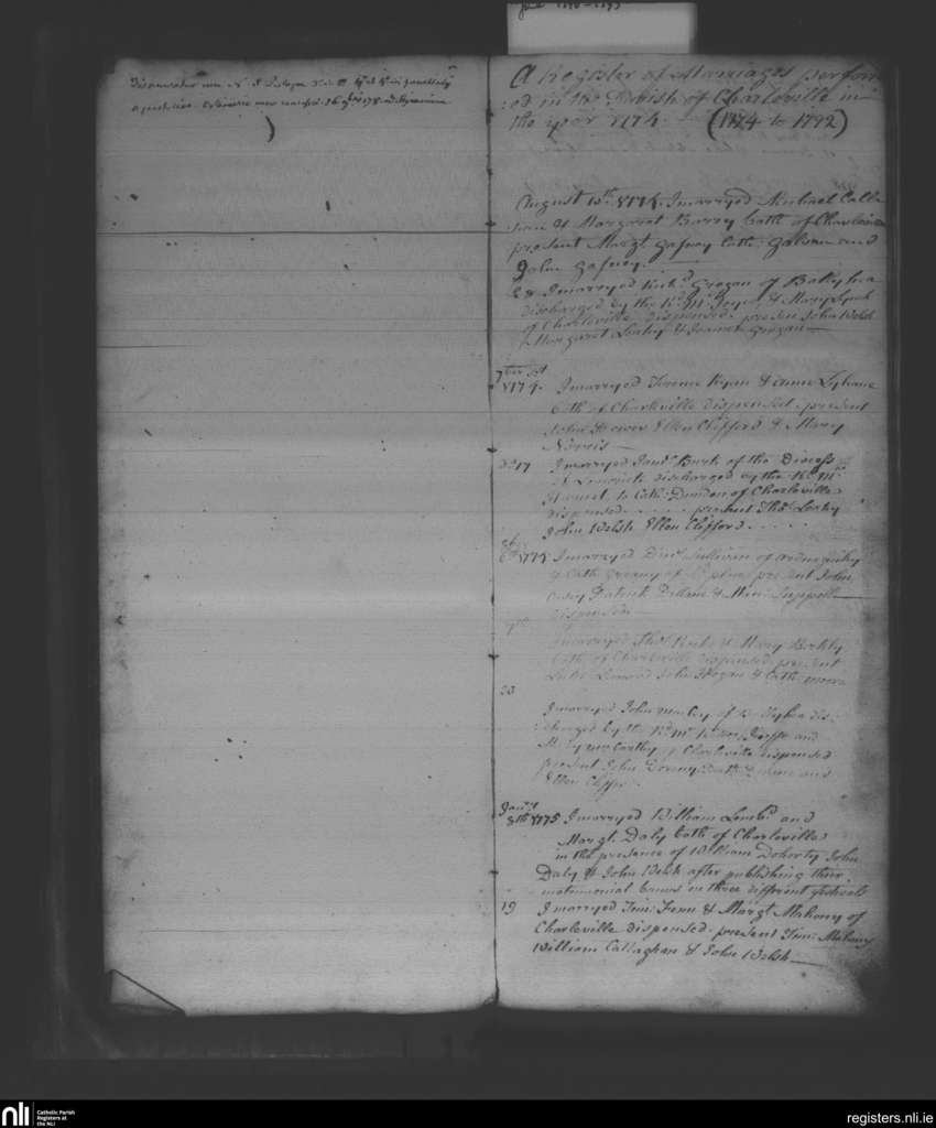 Charleville; County of Limerick, Cork; Diocese of Cloyne. Marriages, Aug. 1774 to Jan. 1775