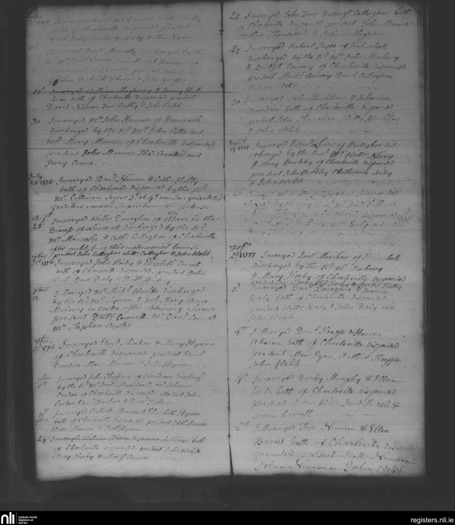 Charleville; County of Limerick, Cork; Diocese of Cloyne. Marriages, June 1776 to Feb. 1777