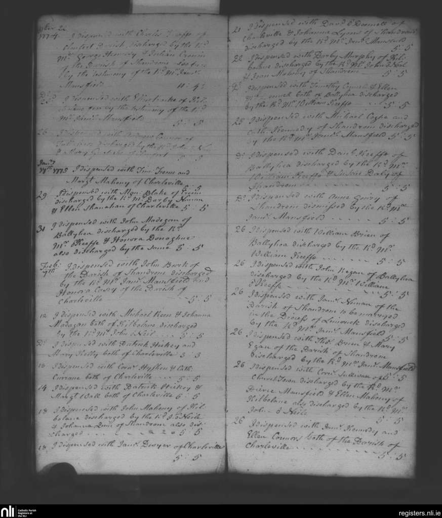 Charleville; County of Limerick, Cork; Diocese of Cloyne. Dispensations, Nov. 1774 to Feb. 1775