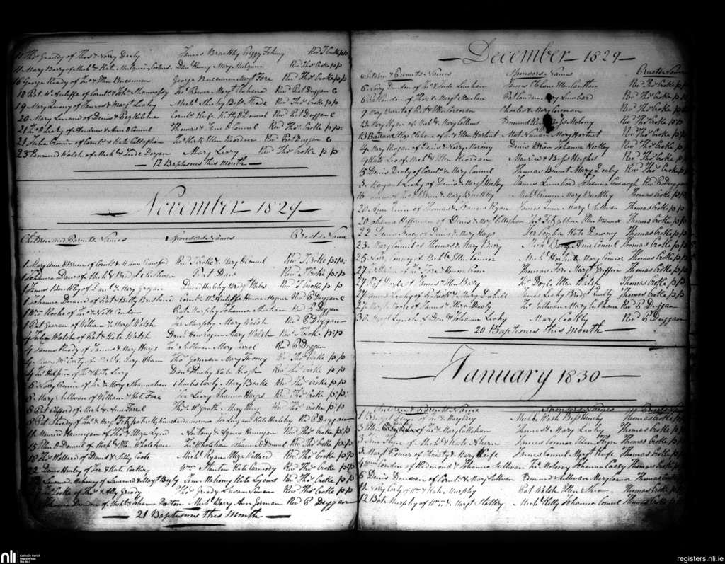 Charleville; County of Cork, Limerick; Diocese of Cloyne. Baptisms, Oct. 1829 to Jan. 1830