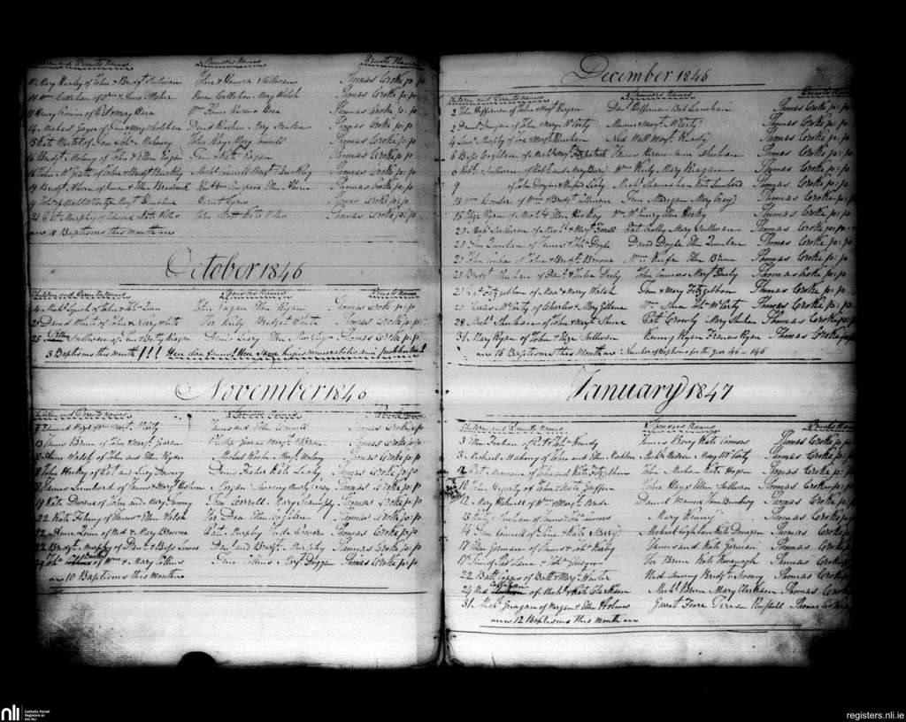 Charleville; County of Cork, Limerick; Diocese of Cloyne. Baptisms, Sep. 1846 to Jan. 1847